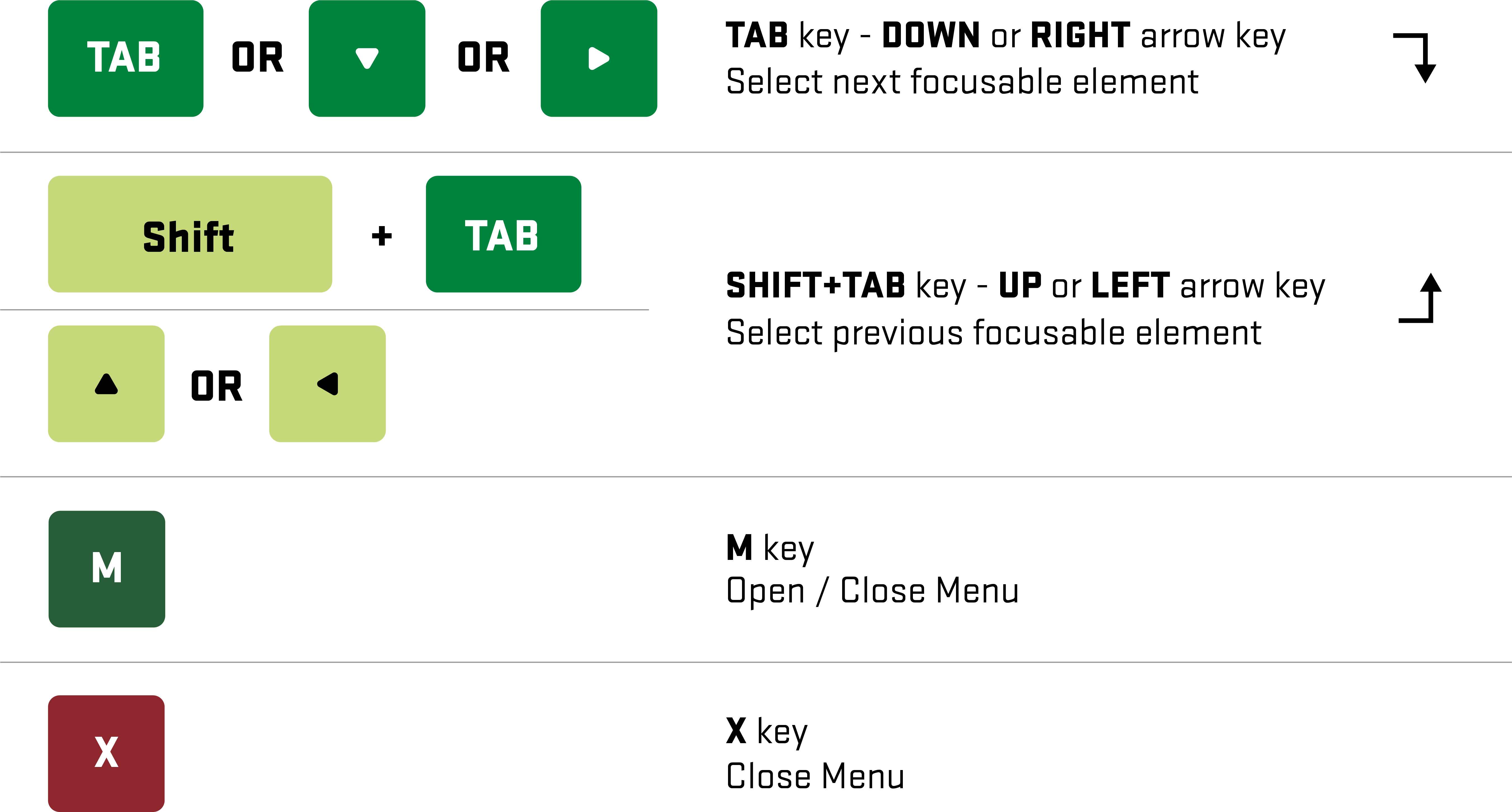 Select next focusable element - SHIFT+TAB key - UP or LEFT arrow key